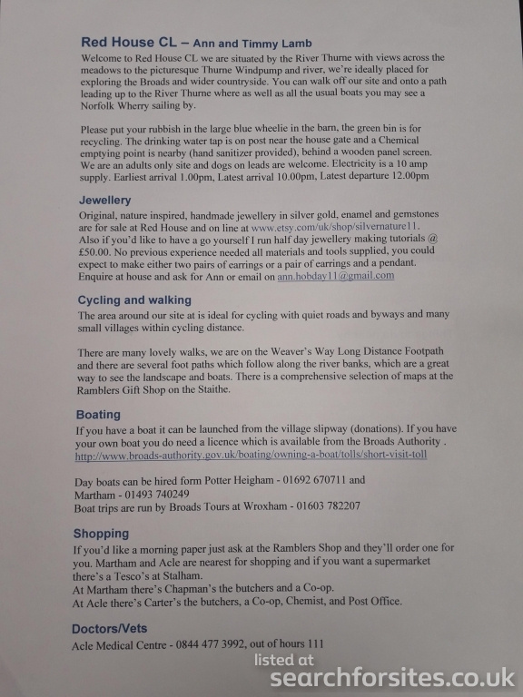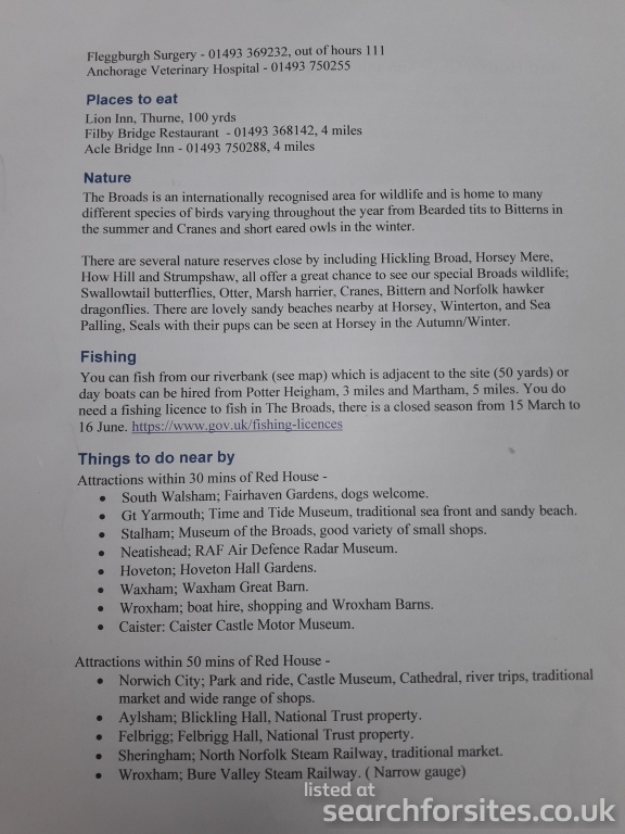 You can fish from our riverbank which is adjacent to the site (50 metres) or day boats can be hired from Potter Heigham, 3 miles and Martham, 5 miles.