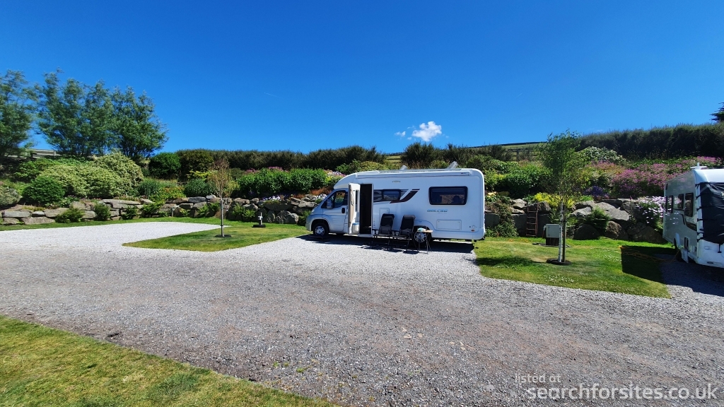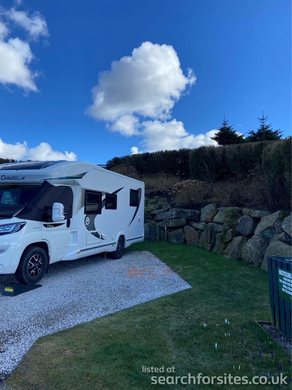 The site has 3 hard-standings and 2 plastic-reinforced-grass pitches, all with electric hook-up. Motorhomes up to 7m welcome. There is a washroom with one w/c, a sink and a shower.
