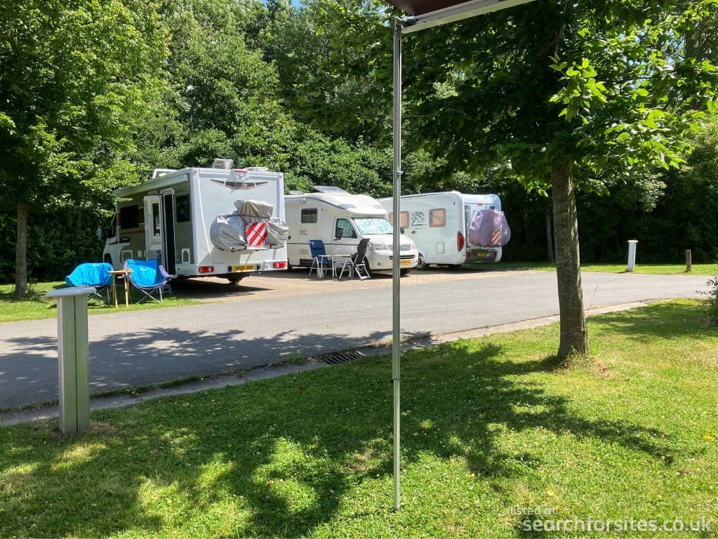 The places are organised in groups of three and are 4 m wide and 9.5 m long. Each place has its own electricity outlet (10amp). At the site entrance there is a service point where you can draw water and discharge waste water. There is also a container park with containers for glass, PMD, paper and residual waste. The sanitary building is equipped with toilets and washing facilities. There are also a number of (slightly more expensive) hardstandings with hookup available for longer stays and these allow use of the adjacent sports stadium showering and washing facilities. Late arrivals can use the automated booking in machine.