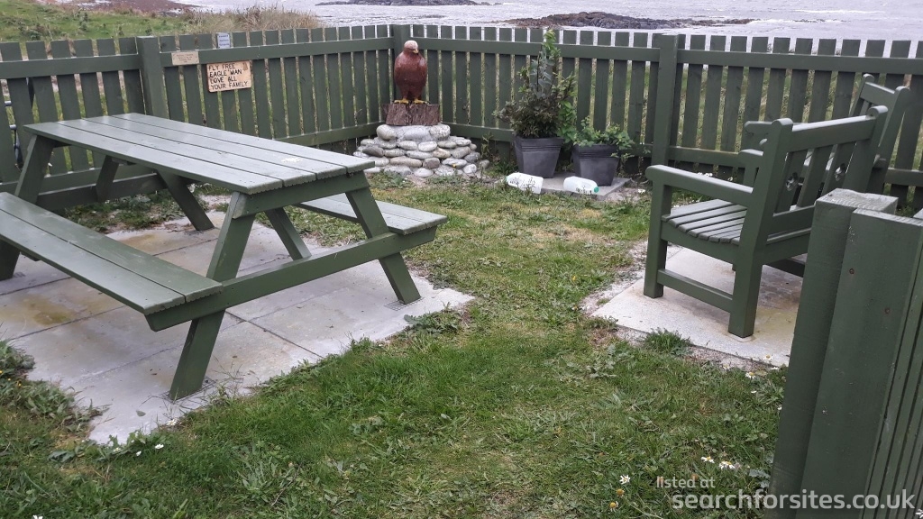Small picnic area with picnic table and a couple of chairs to see over the bay.
