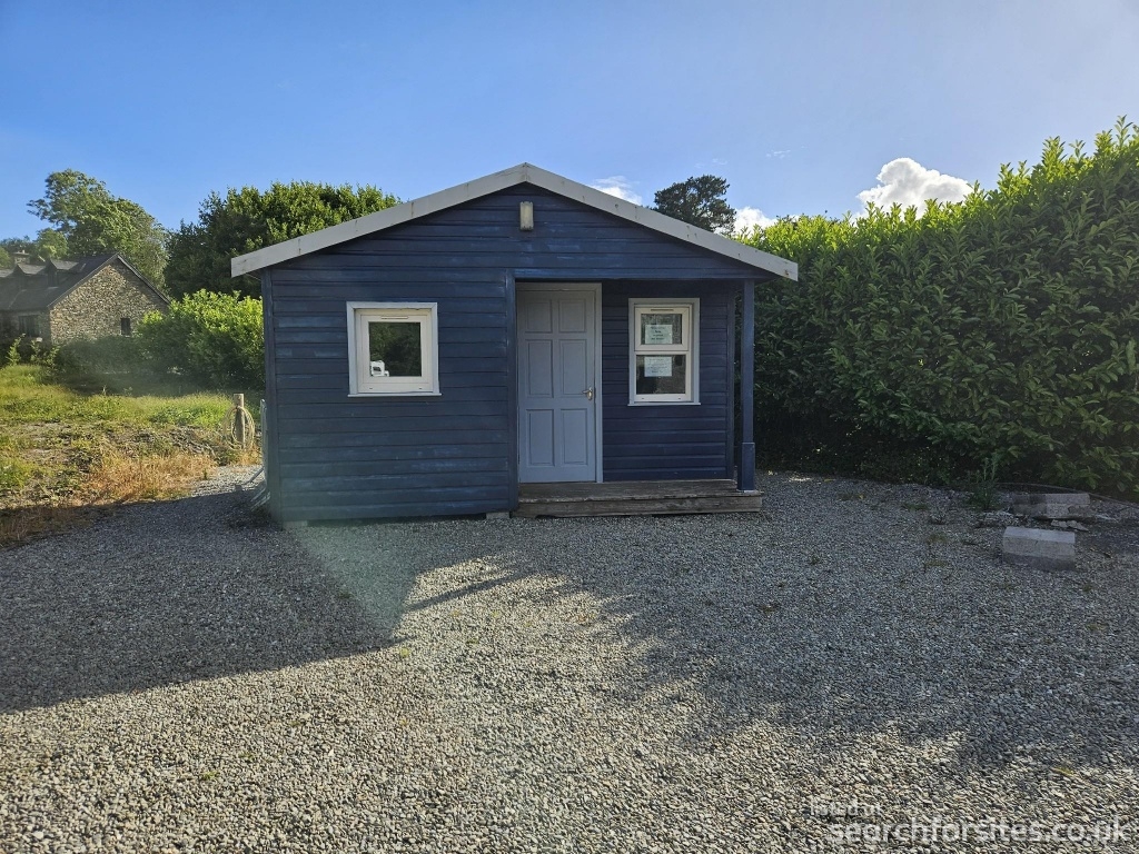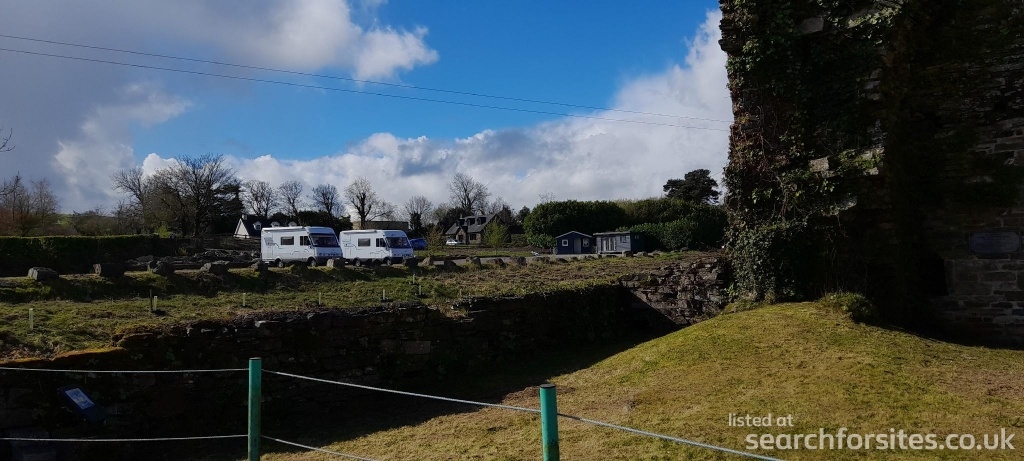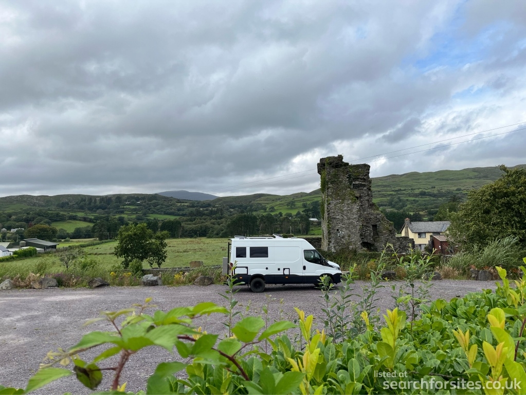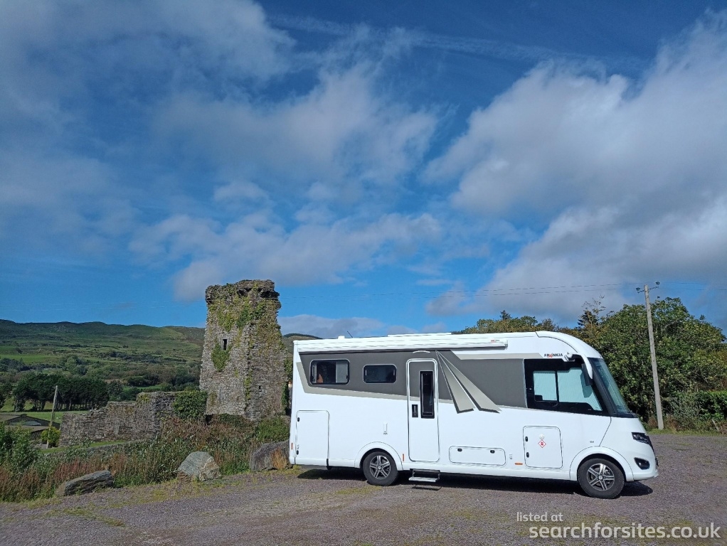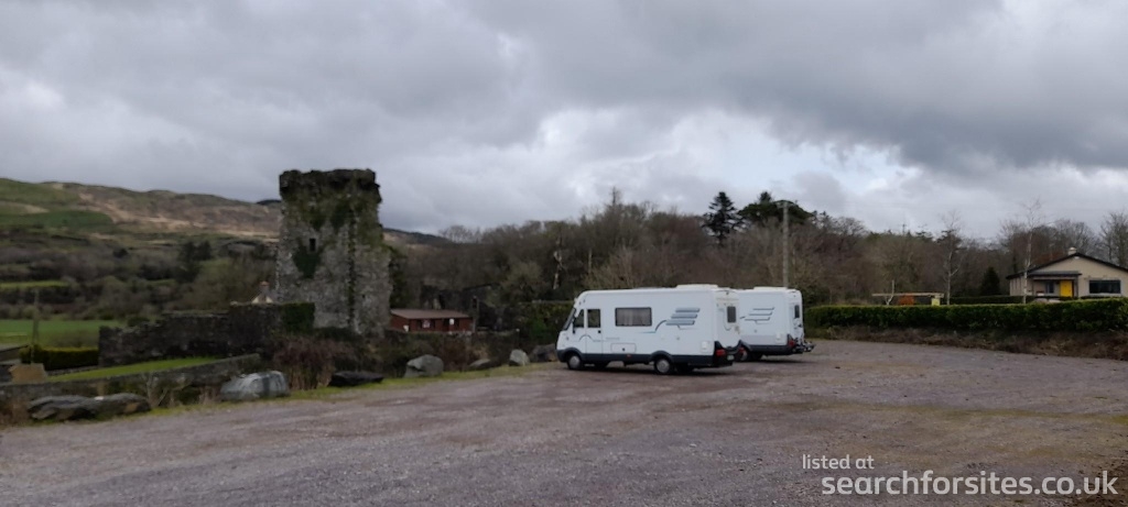 Level parking area looking across the Ouvane river to the ruins of Carriganass Castle and scenic hills beyond. €10 per night