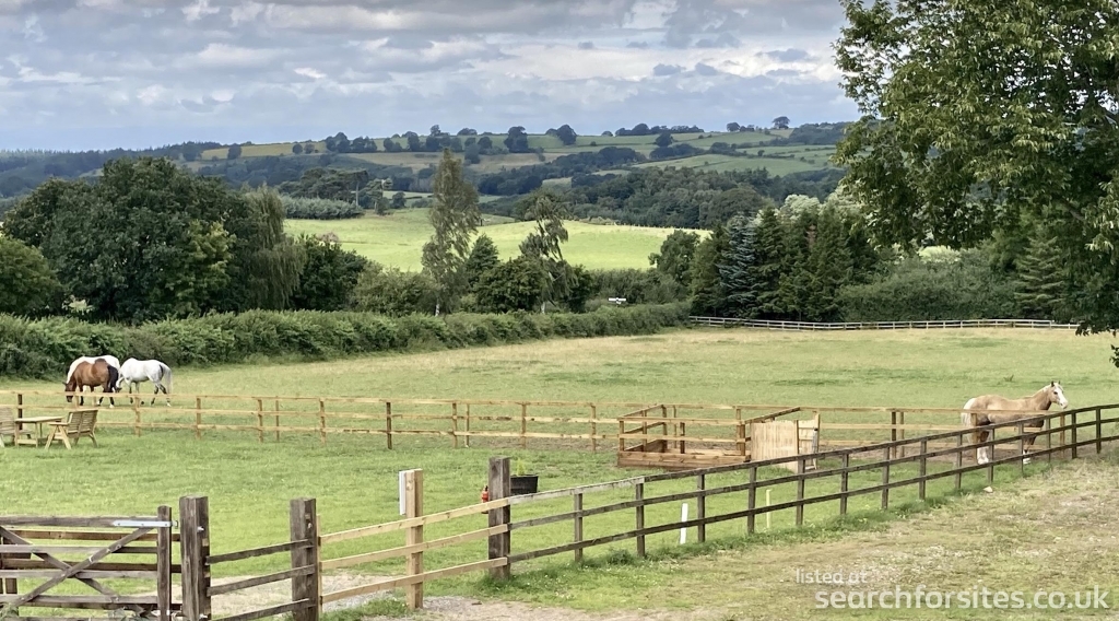 Next to a small equestrian facility with horses in surrounding fields