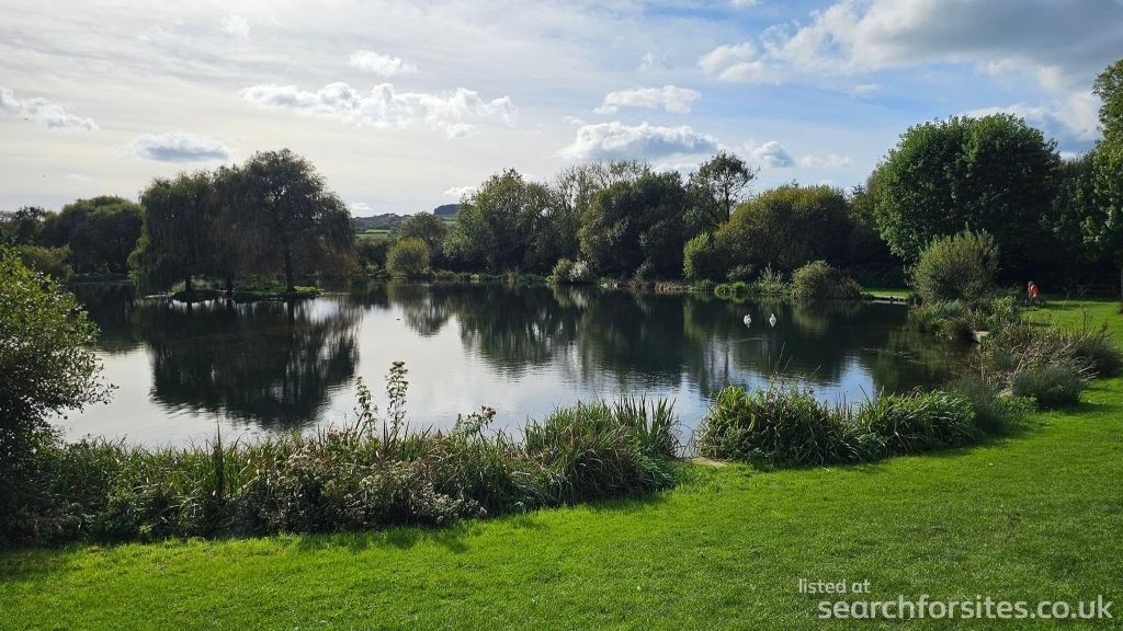 Campsite set up on grassy fields, close to the coast. Swimming lake onsite.