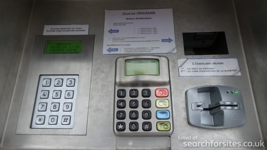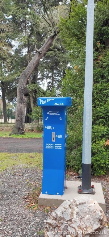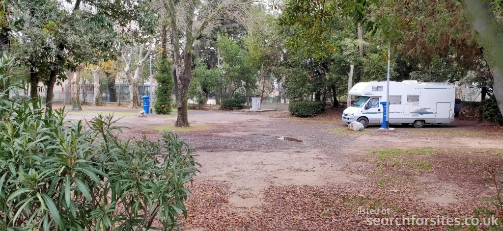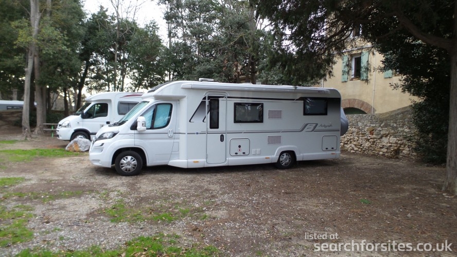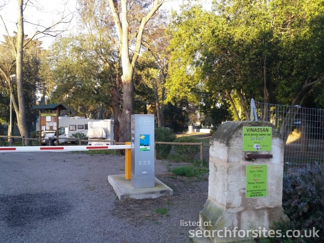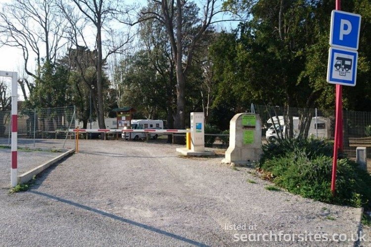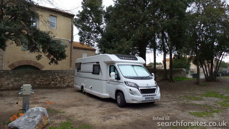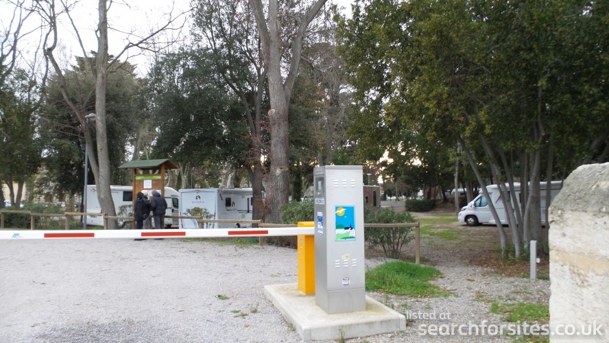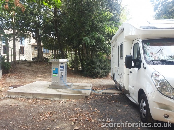 As you turn at the sign, the parking to your left is for cars with a height barrier. The aire is to the right with a barrier across the road with a Flotbleu machine by it.
