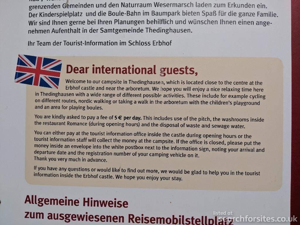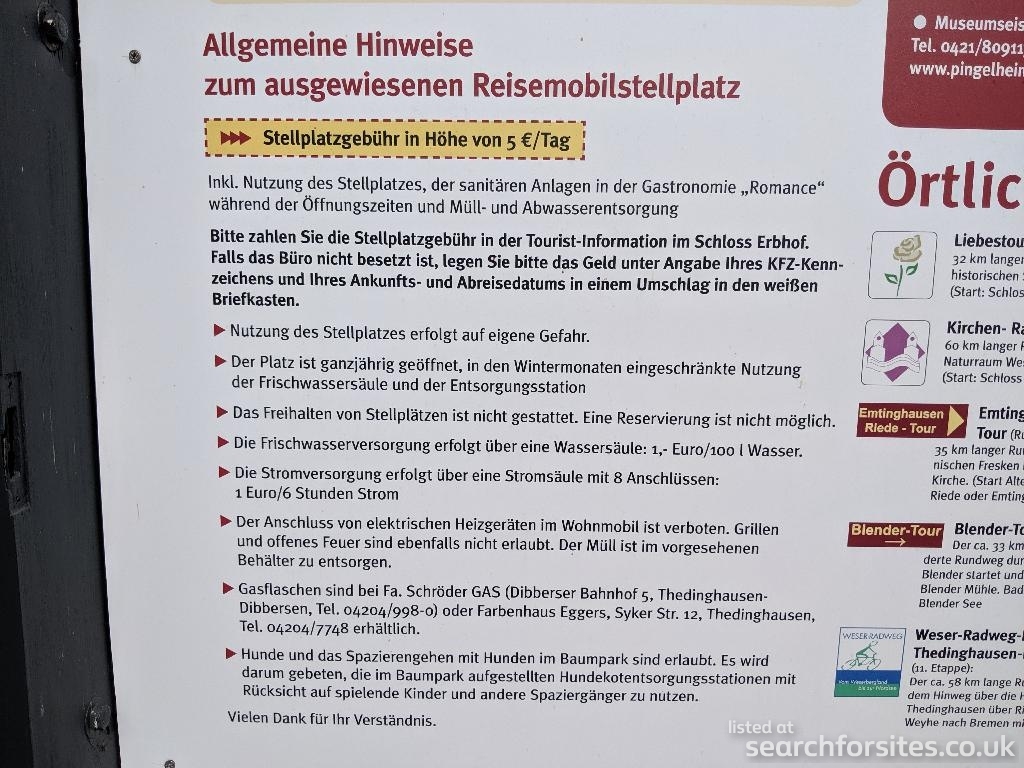 For the overnight stay on the motorhome parking lot, the integrated municipality of Thedinghausen charges a fee of 10.00 €/overnight stay by decision of the integrated municipal council of 15.12.2022. This includes the free use of the toilet facility and the disposal of wastewater and waste. The cost of fresh water (100 liters of water of 10 minutes) and electricity (6 hours) are €1.00 each. In the tourist information there is free access to W-LAN.